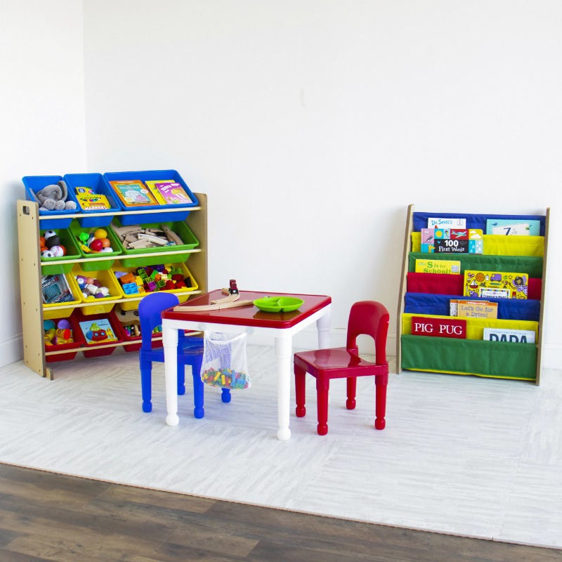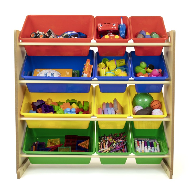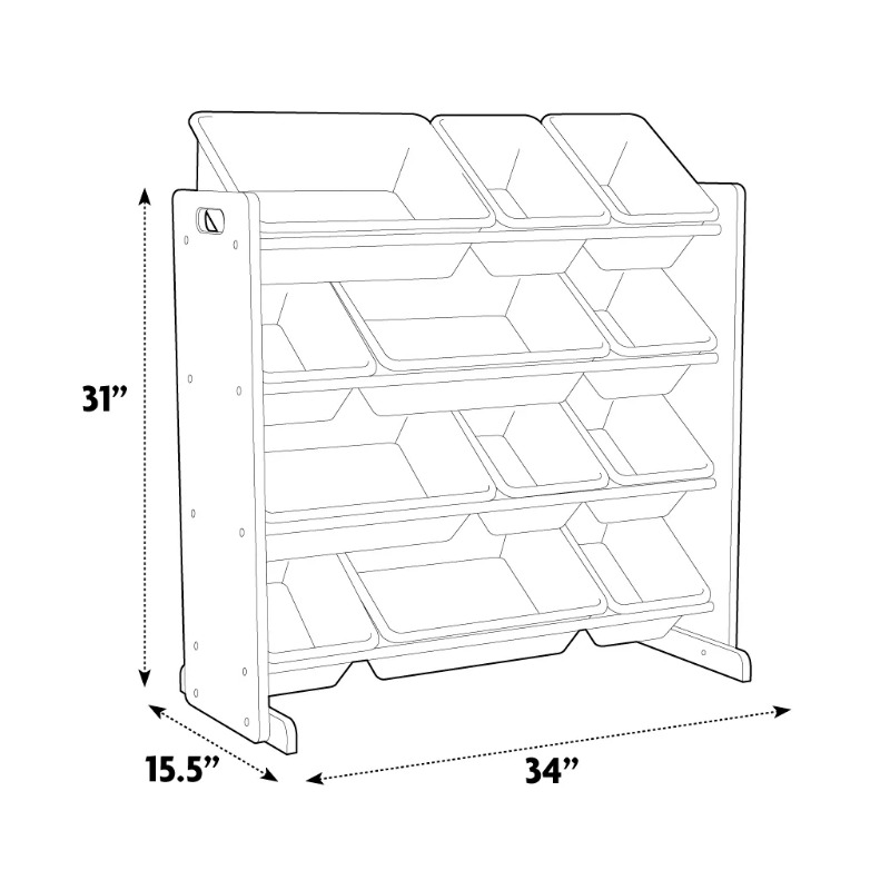 Playtime becomes more fun when your kids can easily take out their toys, books and games and then quickly clean up afterwards. The space saving Humble Crew Toy Storage Organizer with 12 Storage Bins stows your children's toys in easy access BPA and phthalate free plastic storage bins. 8 standard and 4 large colorful storage containers are easy to remove, replace and reposition along the 4 tiered organizer shelves. Storage bins are sized just right within the toy organizer for toddlers and preschool aged children. Sturdy engineered wood construction frame with stabilizing braces and steel shelving rods, 20 pound weight capacity per level. Some assembly is required. A great toy storage box alternative; helping keep your little one's room clean and organized while at the same time teaching color identification, sorting and cognitive skills. Perfect organizational solution for bedrooms, playrooms and bathrooms. Product sizing 34"W x 11"D (15.5"D with stabilizing braces) x 31"H Standard bin sizing: 11.75"L x 8.25"W x 5.25"H Large bin sizing: 16"L x 11.75"W x 5.25"H Additional plastic storage toy bins are also sold separately.