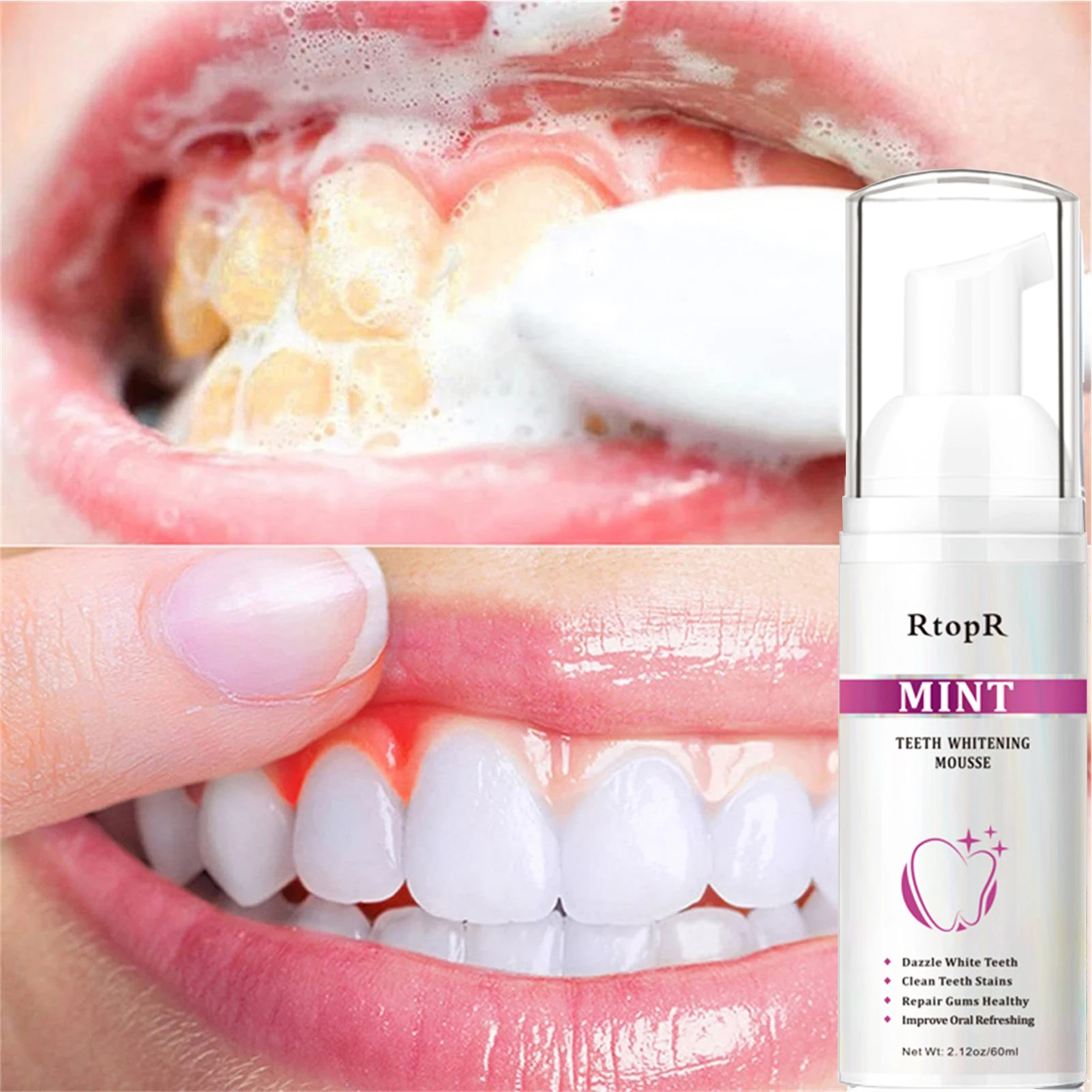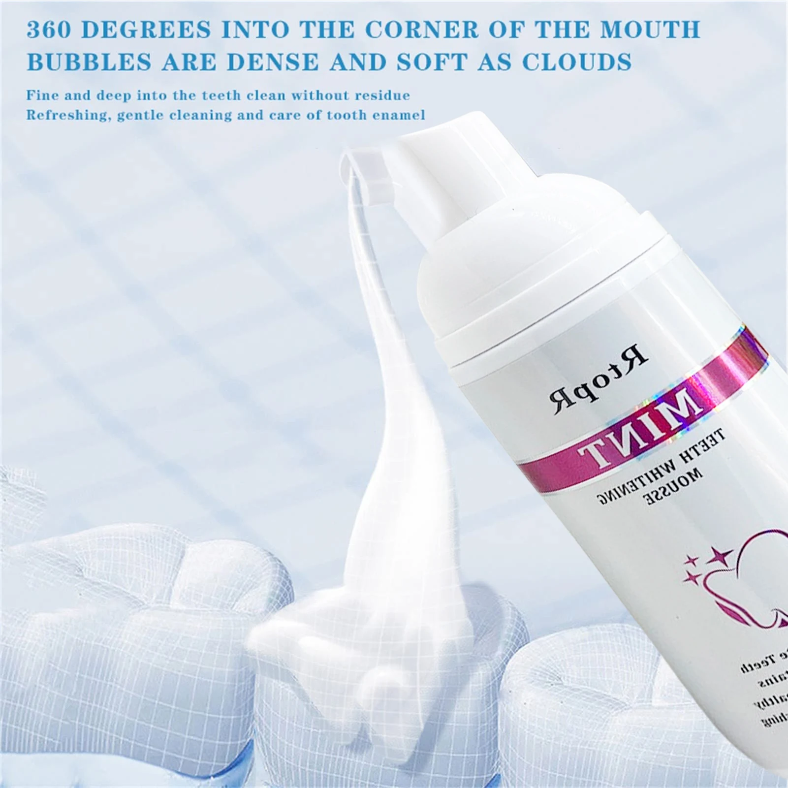 A perfect tooth whitening mousse formula that safely cleans your teeth for a whiter and brighter smile, it can help you say goodbye to chocolate stains, smoke stains, coffee stains, tea stains, bad breath, and food waste and more.